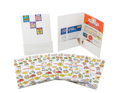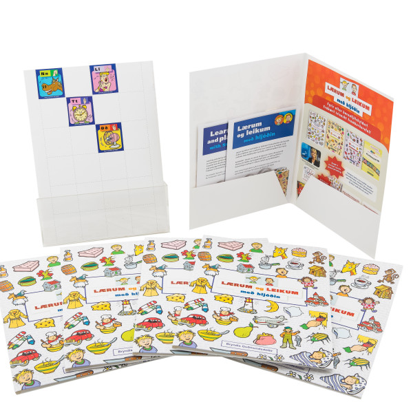 Fallegar möppur með myndum úr Lærum og leikum með hljóðin á bókarkápu. Kjörið fyrir heimaverkefnin eða gögn sem tilheyra nemendum. Á baki möppunnar eru reitir sem henta fyrir límmiðana fyrir hljóðin sem æfð eru hverju sinni, eða til að líma límmiðana sem barnið fær sem umbun í æfingu í skólanum/þjálfun eða heima. Pappír 300 gr. Invercote Creato