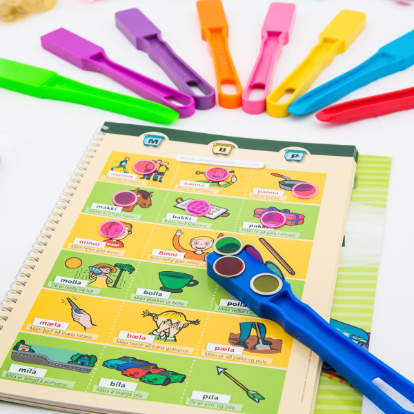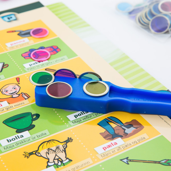 Segulstöngina köllum við gjarna töfrasprota því þegar barnið er búið að segja orðin og leggja segulpeninga ofan á myndirnar í bókunum í hvert skipti þegar orðið hefur verið borið rétt fram, sveipar segulstöngin öllum segulpeningunum upp eins og töfraspota hafi verið veifað!