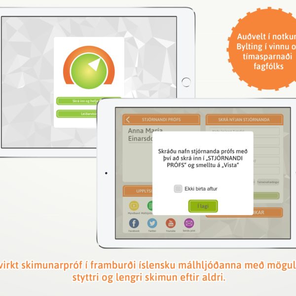 Íslenski málhljóðamælirinn er byltingarkennd og nýstárleg lausn í skimunartækni í spjaldtölvu (iPad) sem ætlað er fagaðilum leik- og grunnskóla og stofnana.